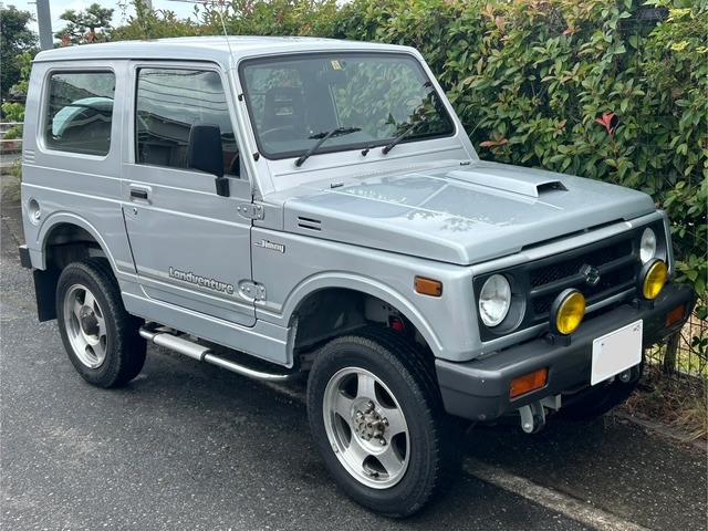 ご覧頂きありがとうございます。前オーナーがとても大切に乗られていた、ジムニーランドベンチャーです。ショック、リフトアップ、強化板バネ、特注木製リアスピーカー、サイドパイプ、リアアンダープロテクター、旧ジムニーステアリング(純正標準ステアリングも車載)ボンネットとルーフは色褪せたため再塗装できれいです。多少の傷、へこみがあるものの、下回りもほとんど錆がなく、きれいです。