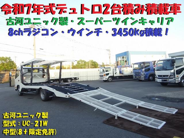 ◎令和7年式、日野「デュトロ」2台積み積載車のご紹介です!上物は古河ユニック製の【スーパーツインキャリア】3450kg積載!上段荷台操作・ウインチ・リアゲート操作に対応した8chラジコン付!巻上能力1.3tのウインチも装備!新開発のチルト&アジャスト機能を搭載し、上段デッキ上げ操作時はワンボタン全に積載できる位置まで連動作動します!下段荷台にミニバンも積載できます!ぜひ一度現車確認にお越しください!お問い合わせお待ちしております!◎